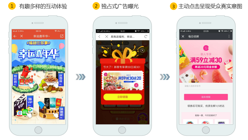 艾得互動廣告以幾百種不同趣味廣告形式為主,在每個app首頁、發現頻道等放置廣告入口,點擊即可進入活動頁面,用戶有多次抽獎機會,將廣告主的優惠券、紅包、VIP特權等設置為其中一個獎品,根據用戶的活躍程度、以往的行為偏好、使用的手機型號(安卓或iOS)、IP所在城市等一系列用戶畫像進行匹配,當屬性匹配的用戶抽獎時,會抽中對應獎品,完成一輪廣告投放。