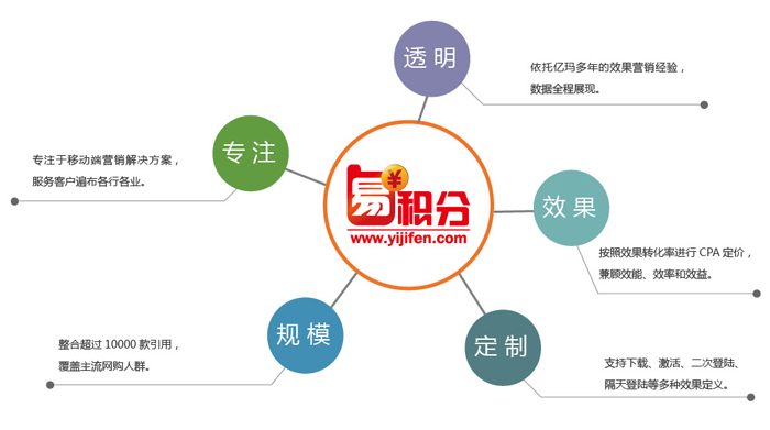 易積分是億瑪旗下移動營銷平臺,也是國內發展速度最快的移動營銷服務商。產品全面覆蓋安卓/iOS兩大平臺,聚集過萬開發者,移動流量日均超過3億,可提供應用推薦、原生廣告、O2O廣告、富媒體廣告等多種廣告展現形式。易積分所服務的客戶分布廣泛,涵蓋了超過90%泛電商客戶,50%以上的手游客戶,80%以上的行業及品牌客戶等,為客戶提供專業的移動營銷解決方案。